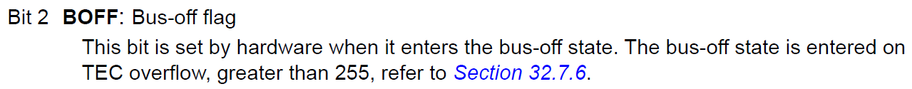 이 중 중요한 것은 BOFF bit 이다. TEC(Transmit Error Counter) 값이 255를 넘어 overflow 되면 bus-off 상태에 들어가고 해당 bit 가 set 된다. 그리고 bus-off 상태가 되면 bxCAN 은 더이상 송수신이 불가해진다.