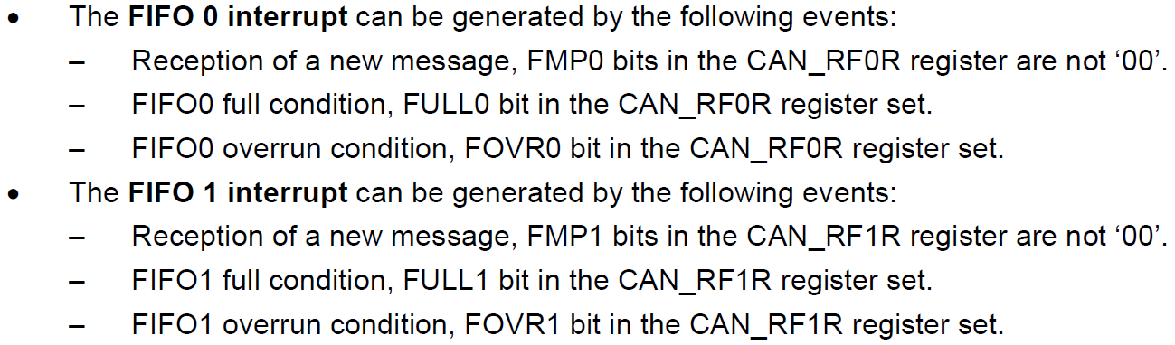 1. CAN_RFxR 레지스터의 FMPx bit 가 '00'이 아닌 경우.(= 새로운 메시지를 수신한 경우) 해당 bit 은 0-3 값을 가질 수 있고 소프트웨어에서 FIFO로부터 메시지를 읽어가면 줄어듬