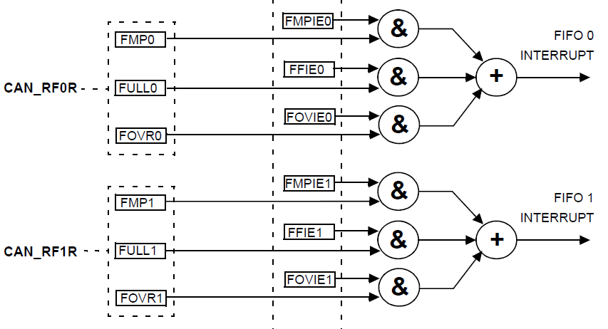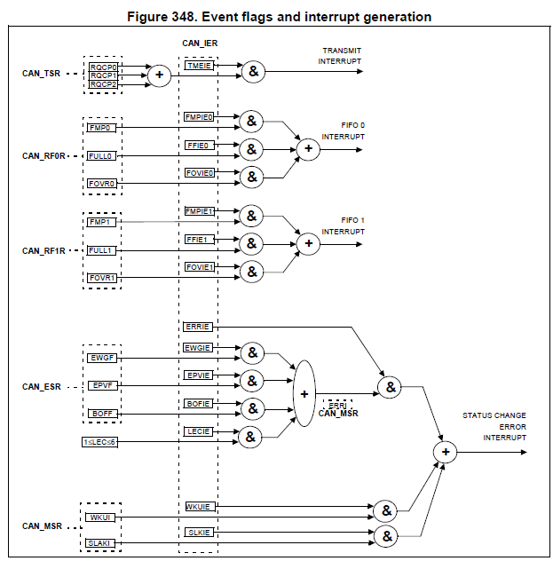 NVIC 엔진으로 가는 4개의 라인이 있다. 각 bxCAN이 이 4종류의 인터럽트를 트리거 할 수 있다.