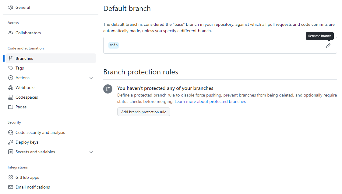좌측 사이드바에서 Branches 를 클릭하고 Default branch 를 master 로 변경한다.