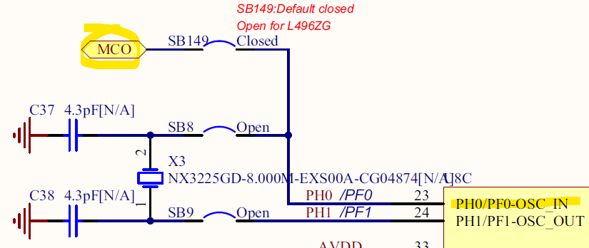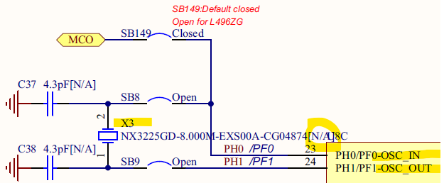 아래 회로도를 보면 MCU에 OSC_IN, OSC_OUT 두 핀이 있고 거기에 External cyristal oscillator가 연결되면 사용할 수 있는데 현재 연결이 안된 것을 알 수 있다. [N/A]