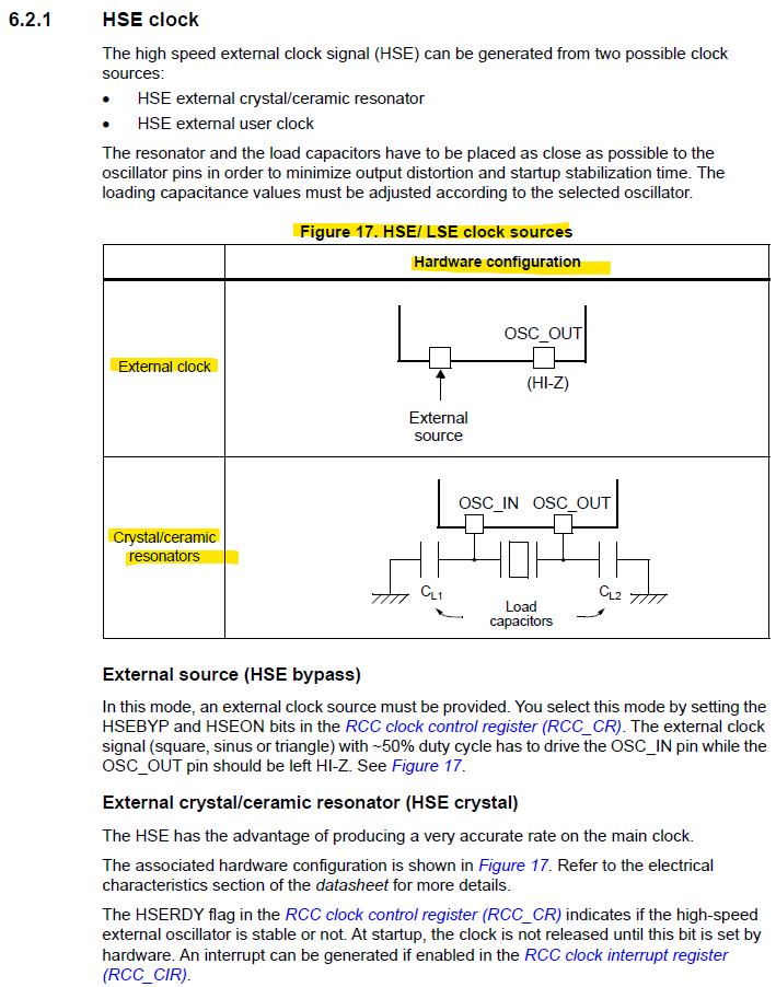 그리고 reference manual에 HSE clock 파트를 보면 HSE를 사용하기 위한 두가지 옵션이 있다고 나와있다. 첫 번째는 위 회로도대로 OSC_IN과 OSC_OUT핀에 crystal oscillator를 연결하는 것이고 두 번째는 External Source를 사용하는 것이다.