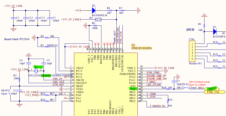 ST-Link에 붙어있는 STM32F103CBT6는 debug와 코드를 flash에 굽기위한 역할을하지만 또한 PA8→MCO→OSC_IN핀을 통해 HSE의 source로 8MHz를 사용할 수 있다.