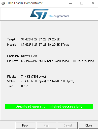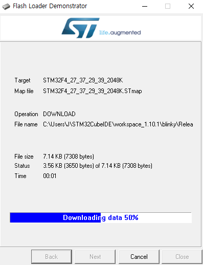 이 hex 파일을 USART 인터페이스를 통해 실행중인 부트로더로 보내고 부트로더는 이 파일을 스트림으로 받아서 Flash memory 0x0800 0000에 다운로드할 것이다.