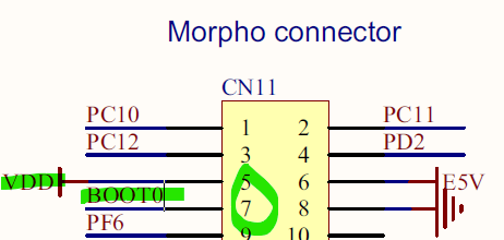 BOOT0 핀의 default state는 0이고 Morpho connector CN11을 통해 나와있으니 5번, 7번핀을 쇼트시키면 1로 만들 수 있다.