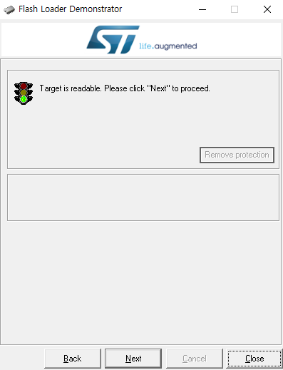 Boot 핀을 올바르게 설정후 Reset 한 상태가 아니라면 아래와 같은 경고가 뜬다.