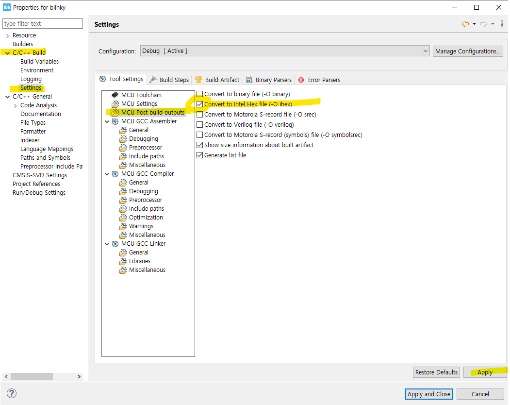 프로젝트 우클릭 - Properties - C/C++ Build - Settings - Tool Settings - MCU Post build outputs - convert to intel Hex file