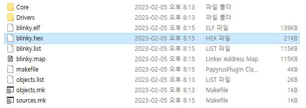 프로젝트 폴더를 찾아가면 .hex 파일이 생성된 것을 볼 수있다.