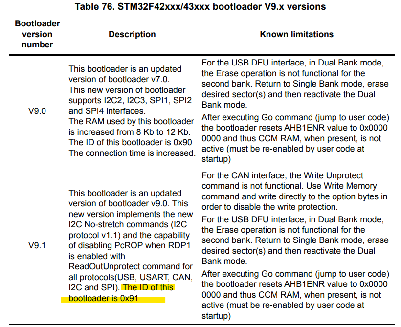 STM32F42xxx 를찾아가니 부트로더 버전에 따라 설명이 나뉘어 있다.