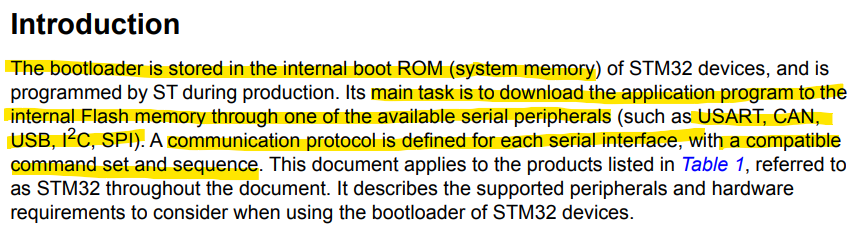AN2606 문서를 확인하면 ST사에서 만든 부트로더가 지원하는 통신방식은 USART, CAN, I2C, SPI, DFU 등 여러 방식이 있다. 그중에서 여기선 USART 방식을 사용하려고 한다.