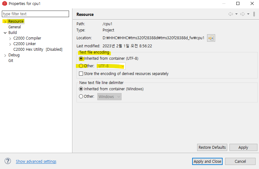 프로젝트 우클릭 - Resource - Text file encoding 변경