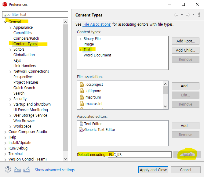 General - Content Types - Text 선택, Default encoding을 입력하고 Update 누름