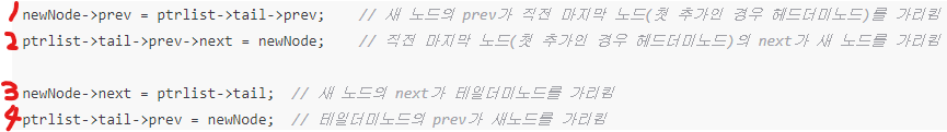 ptrlist->tail->prev->next = newNode; // 직전 마지막 노드(첫 추가인 경우 헤드더미노드)의 next가 새 노드를 가리킴