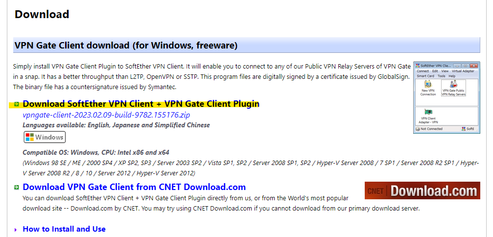 Download VPN Gate Client download (for Windows, freeware) Simply install VPN Gate Client Plugin to SoftEther VPN Client. It will enable you to connect to any of our Public VPN Relay Servers of VPN Gate in a snap. It has a better throughput than L2TP, OpenV