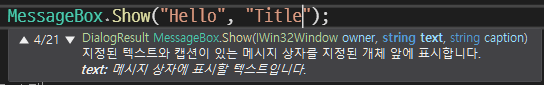 이 상태에서 Shift + ↑/↓ 를 누르면 method의 overload 이동하면서 확인할 수 있음