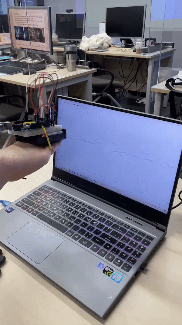 그래프로 확인해보니 가장 정확도가 높은 것은 z각도 값이었다. 손등이 하늘을 향하고 있을 땐 z값이 90도이고, 앞뒤좌우 어디든 옆을 향하면 0도의 값을 갖는다. 손등을 거꾸로 하면 z가 -90도인데 제스처로 사용하지는 않았다. 기울기 센서를 사진과 같이 배치했을 때 손등을 앞을보게 꺾거나 뒤를 보게 꺾었을 때 y가 90도에서 -90도 값이 나왔고 손을 좌우로 움직였을 때 x가 90도에서 -90도 값이 나왔다.
