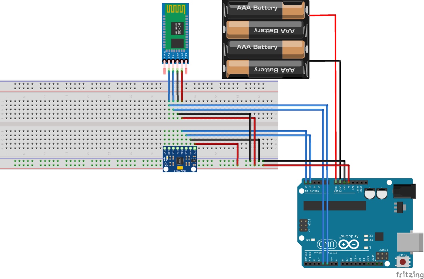 1.5V 건전지 4개를 직렬로 연결한 배터리 홀더를 사용해 아두이노의 vin에 전원을 공급한다.