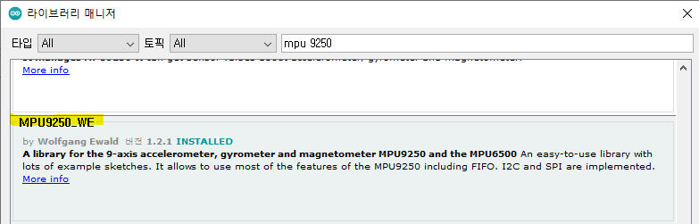 라이브러리 매니저에서 mpu 9250 을 검색하고 MPU9250_WE 라이브러리를 설치한다.