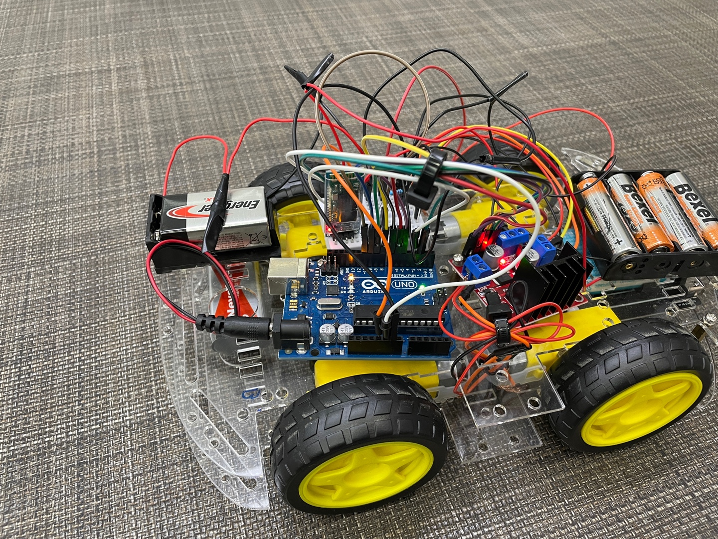 서보모터를 사용해 앞바퀴는 조항장치로 제어하고 싶었는데 못한게 아쉽다. 다음에는 조향장치가 있는 프레임을 구입하거나 3d프린터를 사용해 조향장치를 제어해보고 싶다.