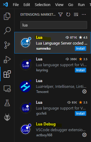Visual Studio Code 실행 후 Lua 와 Lua Debug extension 설치
