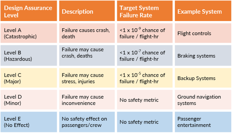 항공기 내부 소프트웨어에서 발생할 수 있는 위험의 정도를 기반으로 하는 분류 체계이다. 이것은 DO-178C에서 정의되며, 항공기 소프트웨어 인증을 위해 사용된다. 안전 평가 프로세스(safety assessment process), 위험도 분석(hazard analysis)으로부터 결정되는 레벨로서, 시스템의 고장 영향성을 판단하는 기준으로 삼는 것으로 다음과 같은 단계가 있다.