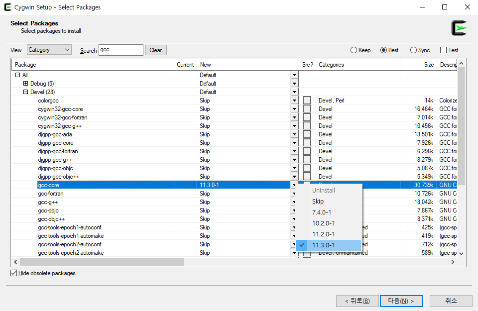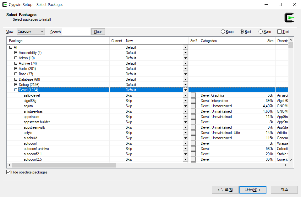 All-catecory를 열고 devel 카테고리에서 gcc-core, make나 cmake 등 editor 카테고리에서 vim 등을 같이 설치해주자.