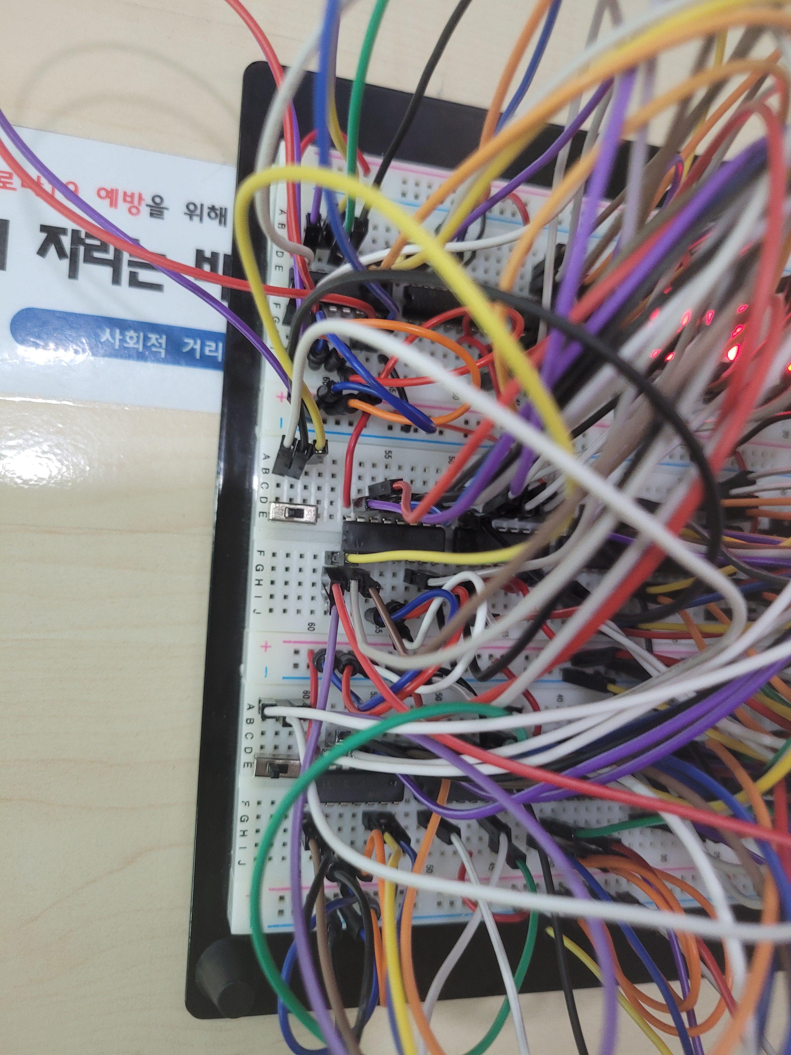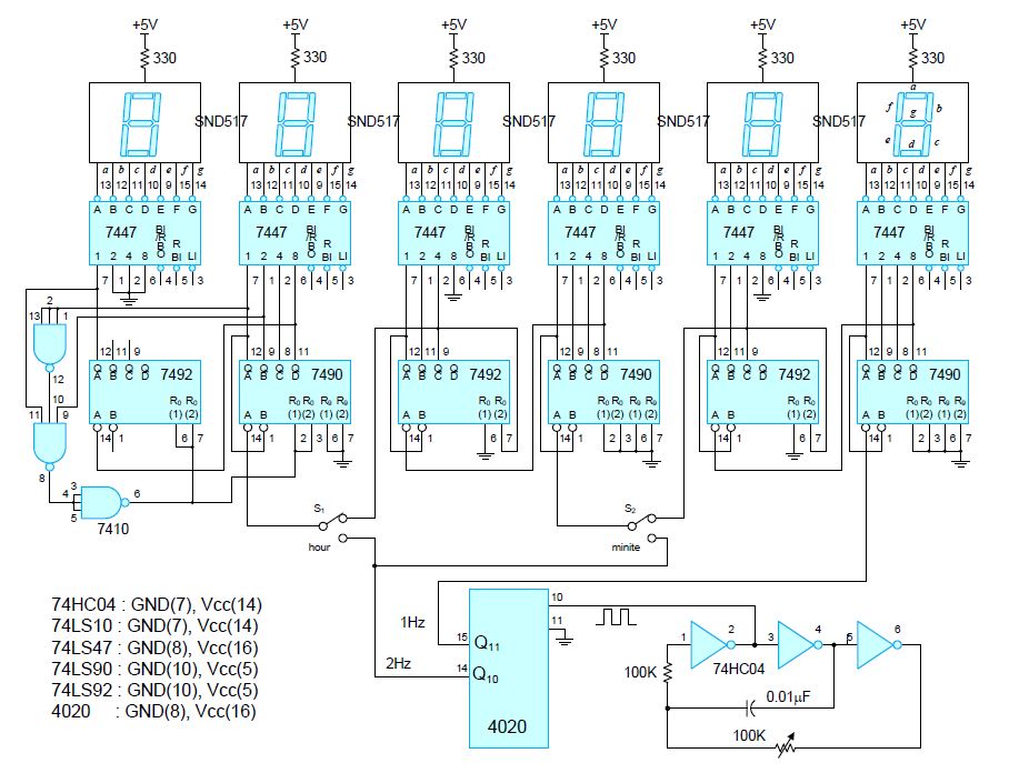 위에서 얻어진 1Hz 구형파를 초 일의자리의 클락펄스로 주고 출력을 다시 다음 자리의 입력으로 사용하는 식으로 구성한다. 그리고 분 시의 일의자리에는 각각 토글스위치를 달아줬는데 위 전체 회로도에서 스위치를 내리면 2Hz가 클락펄스로 들어와서 카운트 속도가 더 빨라진다. 또한 시 부분은 11을 넘지 않도록 7410의 NAND게이트를 달았다.