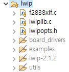 추가로 필요한 파일이 f2838xif.c, lwiplib.c, lwipopts.h 이다. 예제파일에서 복사해 가져온다.
