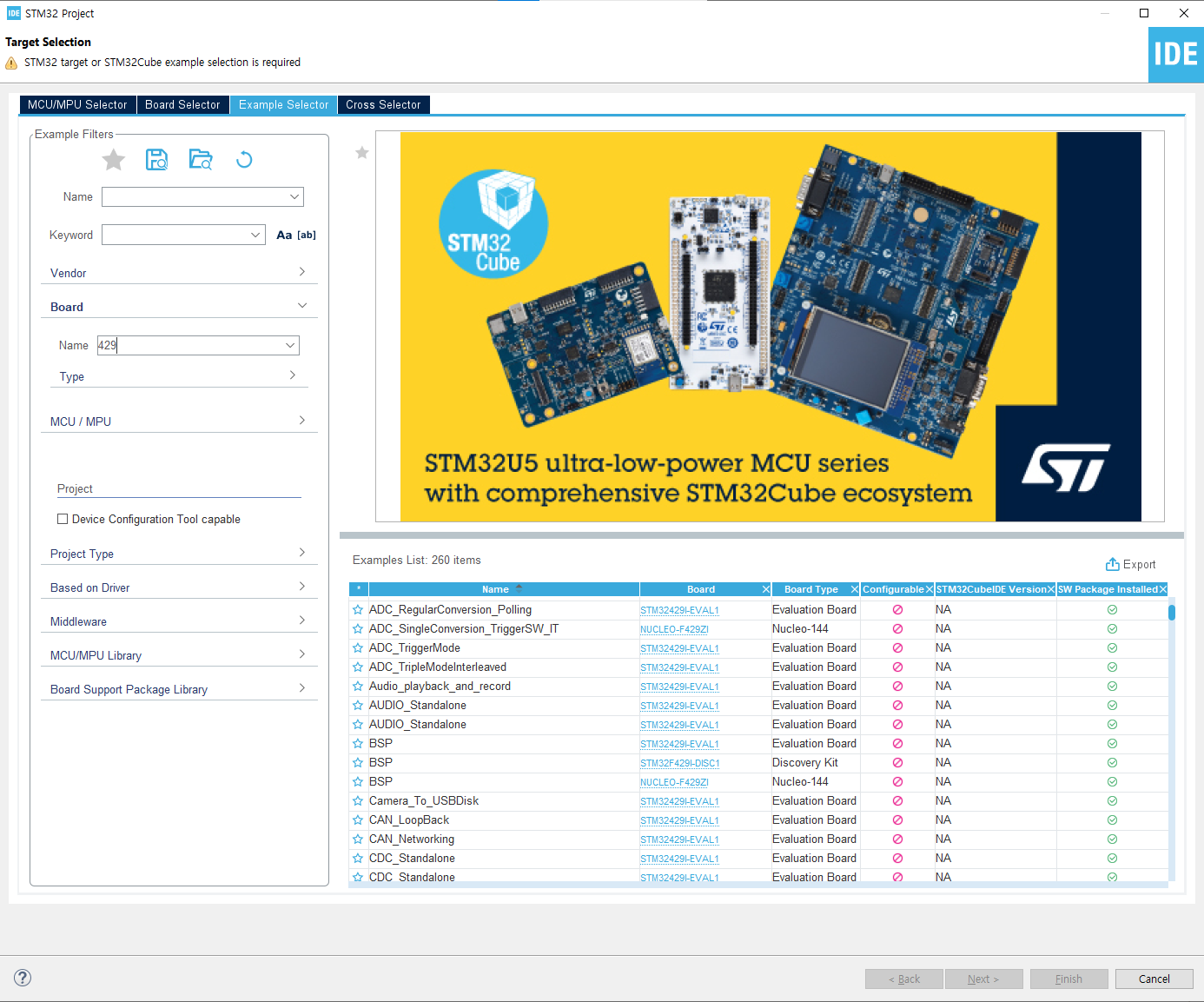 개발보드인 경우에도 Board Selector 옆의 MCU/MPU selector 를 통해 프로젝트를 생성할 수 있다. 다만 첨부터 많은걸 직접 설정해 줘야 한다.