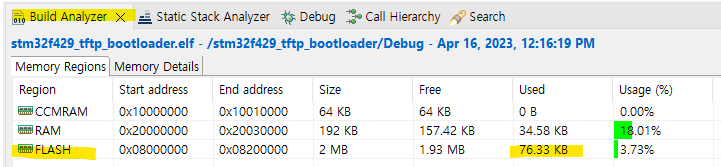 예전 IAP 예제에서는 부트로더가 first 2 sectors만 차지했는데 이건 lwIP가 올라가니까 사용하는 Build Analyzer로 확인해보면 76.33KB를 사용하고 있다.