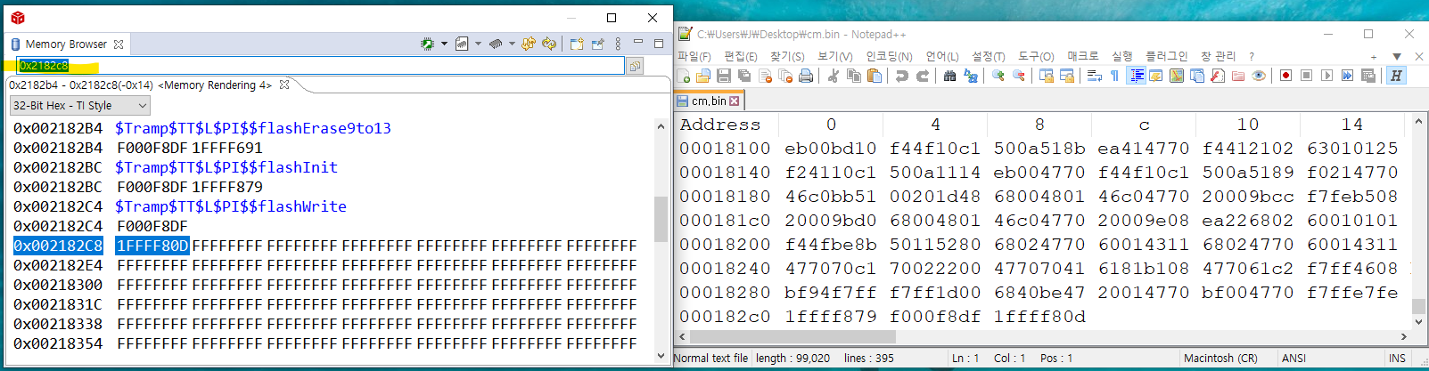 .bin파일의 내용이 실제 플래시메모리에서 읽은 값과 시작주소부터 끝까지 동일한 것을 볼 수 있다.