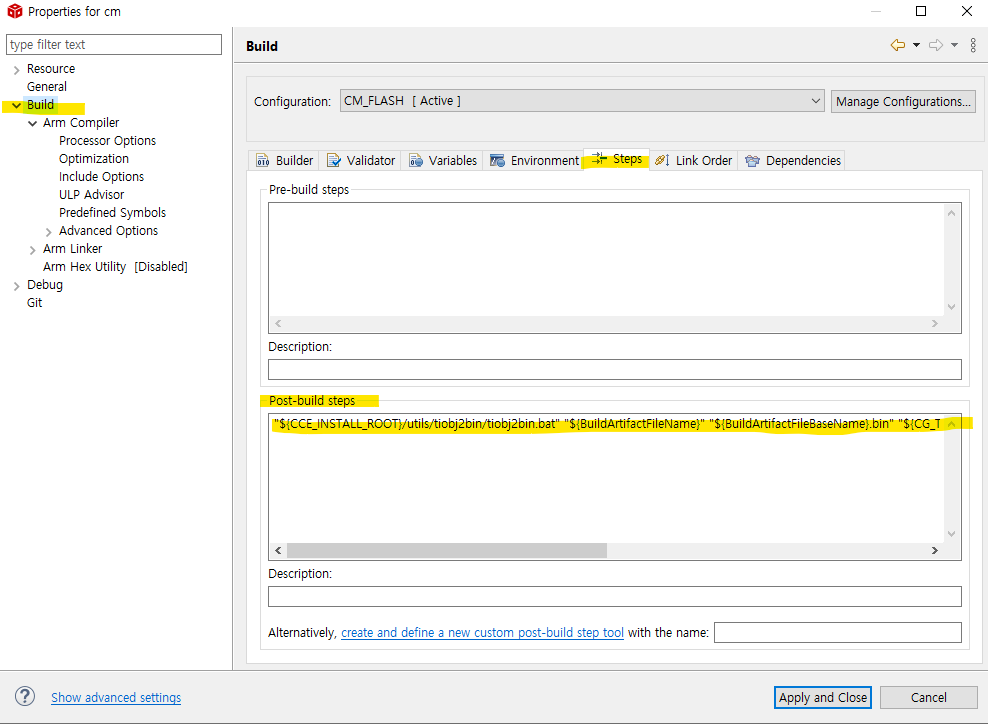 중간의 {CCS_INSTALL_ROOT}나 {CG_TOOL_ROOT}는 설치된 컴파일러나 IDE 버전에 따라 다르다. Properties - Linked Resources에서 확인할 수 있다.
