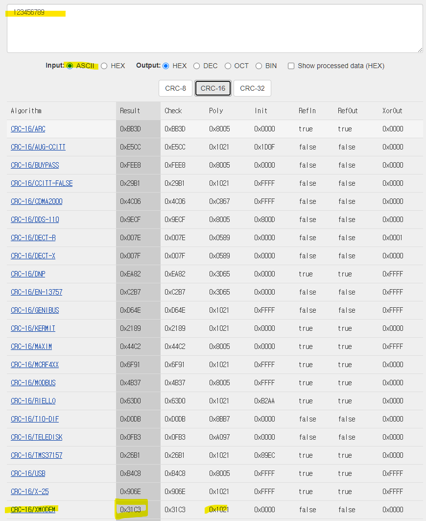 문자열 "123456789"의 CRC-16/XMODEM 결과는 0x31C3이다.