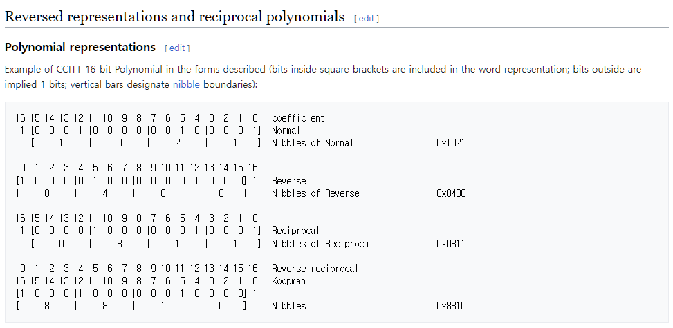 이 다항식의 16진수 표현인 노멀 폴리는 0x1021이고, 리버스 폴리는 0x8408이다. CRC-16/XMODEM은 RefIn = false, RefOut = false 조건이기 때문에 대부분의 SW 구현에서 노멀 폴리인 0x1021을 사용한다.