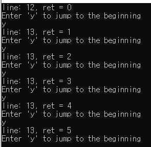if ((ret = setjmp(env)) == 0) printf("line: %d, ret = %d\n", __LINE__, ret);