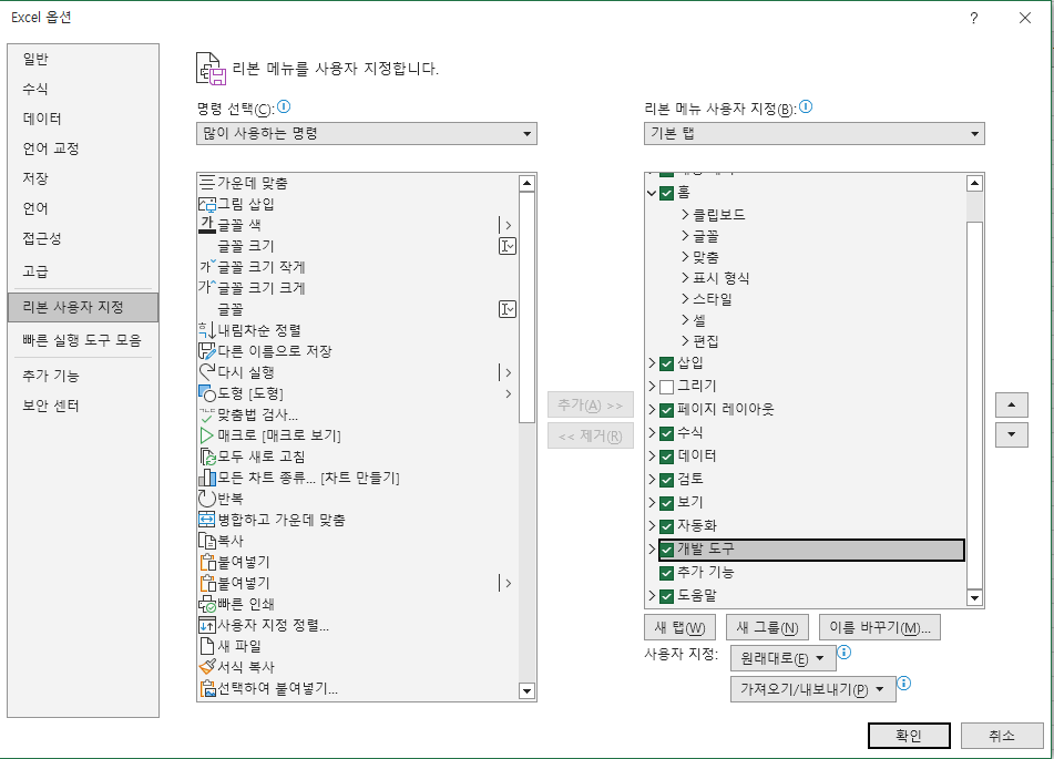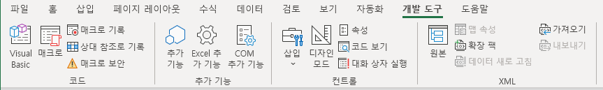파일 - 옵션 - 리본 사용자 지정 에서 개발도구를 체크 한 뒤 개발 도구 탭에서 Visual Basic을 클릭해도 된다.