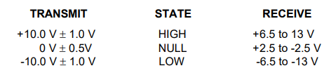 - LOW 상태일 때 송신단에서는 -10V +/- 1V로 전송하고 수신단에선 -6.5V ~ -13V 사이로 수신한다.
