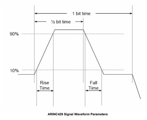slew rate는 ARINC waveform의 rise time, fall time을 뜻한다. 더 구체적으로는 펄스의 rising edge와 falling edge에서 전압 진폭이 10%↔90%로 변하는데 걸리는 시간이다.