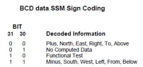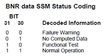 BIT 31-30에 위치한 Sign/Status Matrix (SSM) 필드는 어떤 데이터 타입이 전송되는지를 나타내는 label에 따라 다른 정보를 제공할 수 있다. 주로 data의 부호, 방향 또는 위치 정보를 포함하거나 source 장비의 작동 상태를 보고하기 위해 쓰인다.