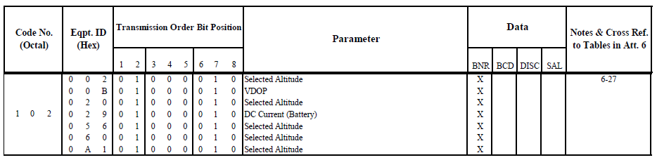 예를들면 BNR Label 102는 Selected Altitude 인데 이 데이터는 Flight Management Computer (Equipment ID 002Hex)로 부터 받을 수도 있고 또는 DFS System(Equipment ID 020Hex)이나 FCC Controller (Equipment ID 0A1Hex)로 부터 받을 수도 있다.