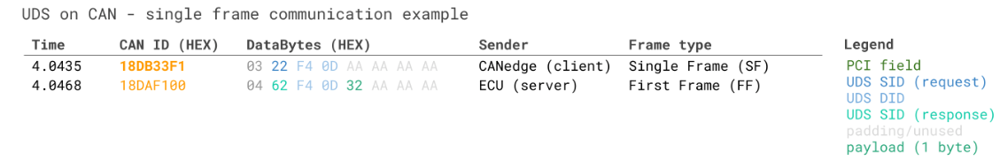 예를들어 SID 0x22에 대한 Positive response frame은 먼저 SID는 0x62 (0x22 + 0x40)이고 이어서 2 byte의 요청 DID가 오고 그 뒤로는 요청된 DID에 대한 실제 data payload가 이어질 것이다.