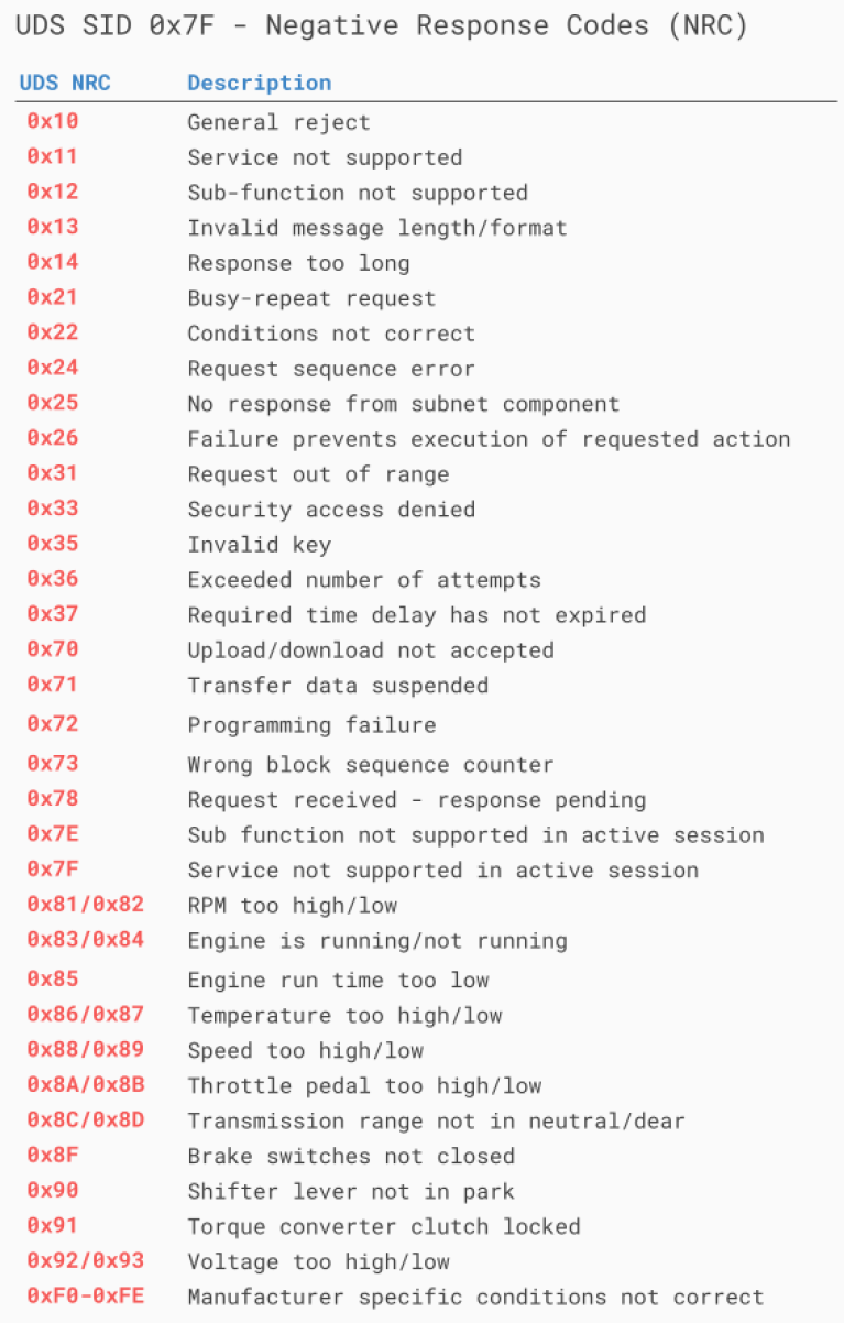 SID 0x7F의 NRC(Negative Response Code) 목록