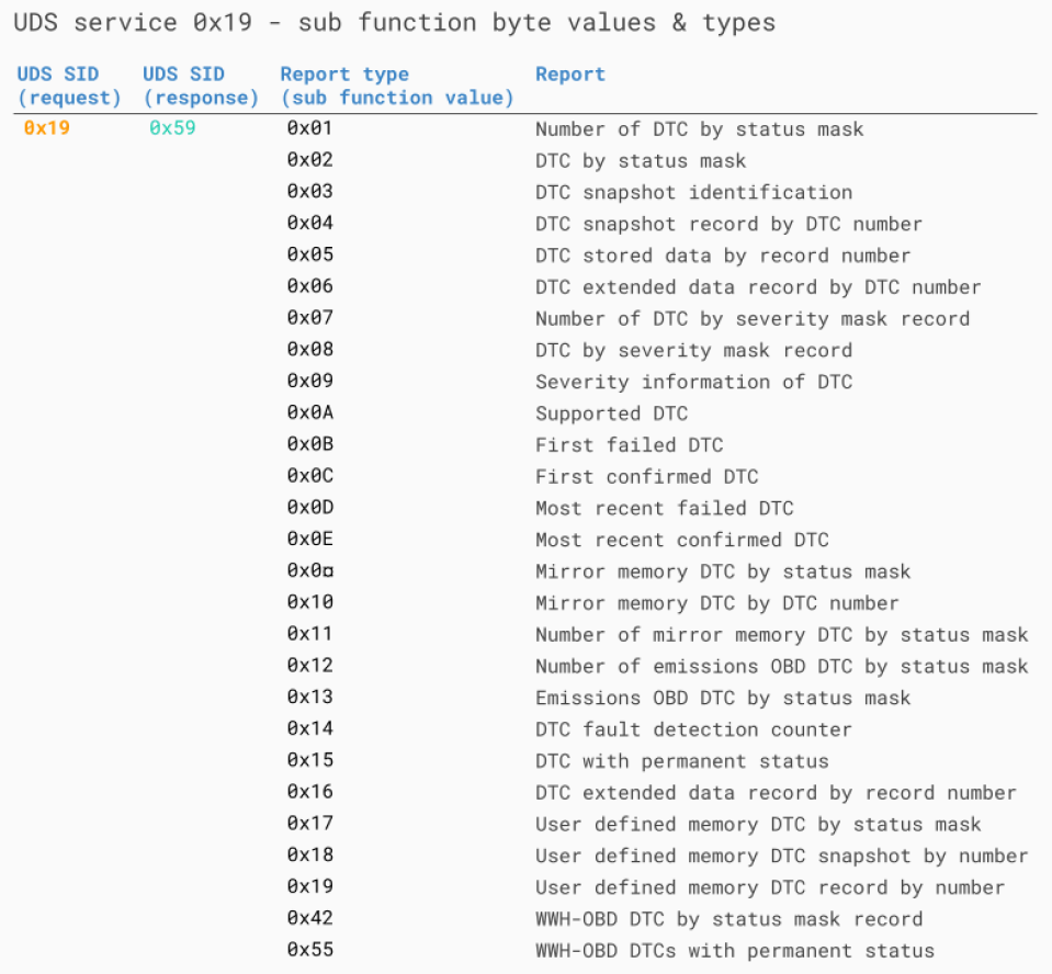 예를들어 SID 0x19(Read DTC(Diagnostic Trouble Codes) Information)를 요청하는 경우 Report type을 지정하기 위해 아래 sub function byte를 사용할 수 있다.