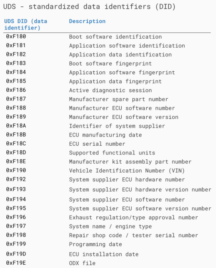 예를들어 ECU의 Vehicle Identification Number(VIN)를 읽기 위해서는 0x22 다음에 0xF190이 온다.