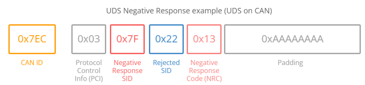 반면, 해당 서비스가 ECU에 의해 지원되지 않거나 오류가 있어 부정적으로 응답하는 경우의 Response frame은 그 구조가 아래와 같이 정형화되어 있다.