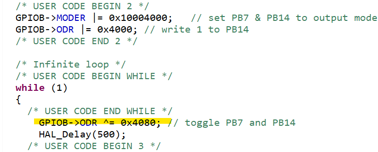 output의 default 상태가 0이니까 while문 위에서 PB14번만 켜둔 뒤 while문 내에서 같이 토글시키면
