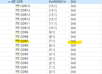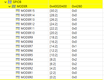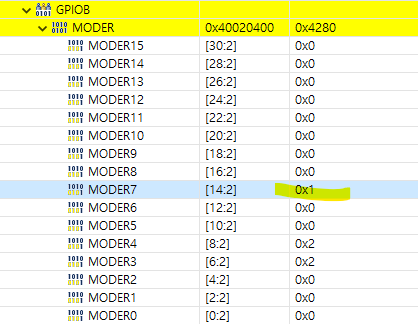 다시 SFRs 화면에서 GPIOB MODER7을 확인해보면 실제 0x1 값을 가지고 있는걸 보니 output 모드인 01로 잘 설정이 돼있다.