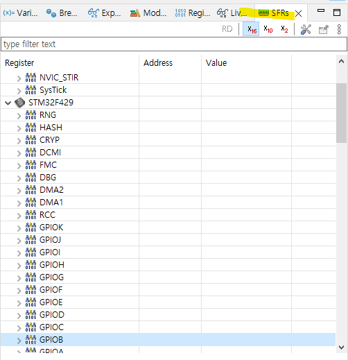 화면 우측의 SFRs를 클릭한다. 먼저 들여다 볼 것은 GPIOB이다.