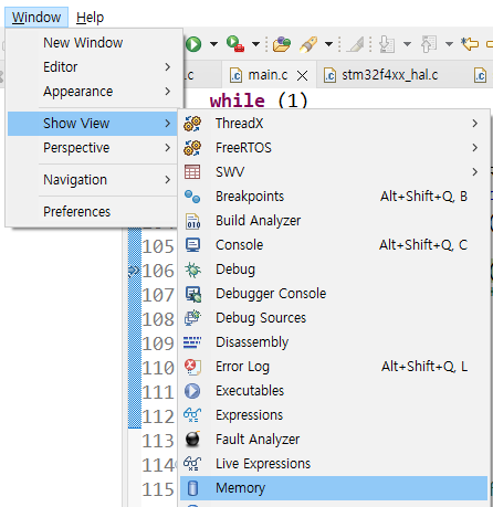 Windows- show View- Memory를 클릭한다.