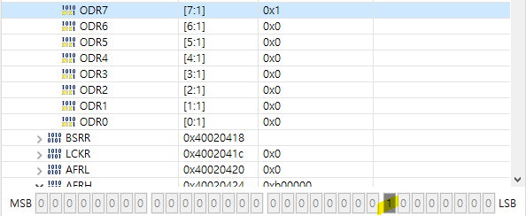 ODR 번지의 Value를 찾아서 여기서 직접 값을 변경해도 LED를 조작할 수 있다.